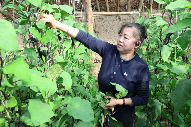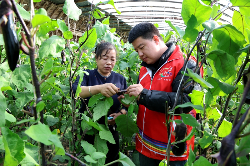 近日,走进临泽县蓼泉镇双泉村蔬菜种植户王爱玲家的温室大棚内,暖意扑面而来,紫色的长茄挂满枝蔓,长势喜人。王爱玲正在垄间,仔细查看叶子背面的虫情。此时恰逢临泽县农业技术推广中心工作人员上门回访,工作人员俯身查看植株后,又给种植户王爱玲讲解了下一步生物防治的要点。