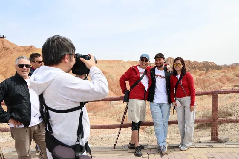张掖七彩丹霞以地貌色彩艳丽、层理交错、气势磅礴、场面壮观而称奇,其色彩之多、观赏性之强、面积之大冠绝全国,是当之无愧的世界级自然遗产,吸引着无数中外游客慕名前来,一睹风采。当日,旅行团的游客们漫步丹霞栈道,近距离观赏色彩交织的地貌奇观,不时驻足拍照、交流赞叹,沉浸式感受大自然的鬼斧神工,赞美之情溢于言表。