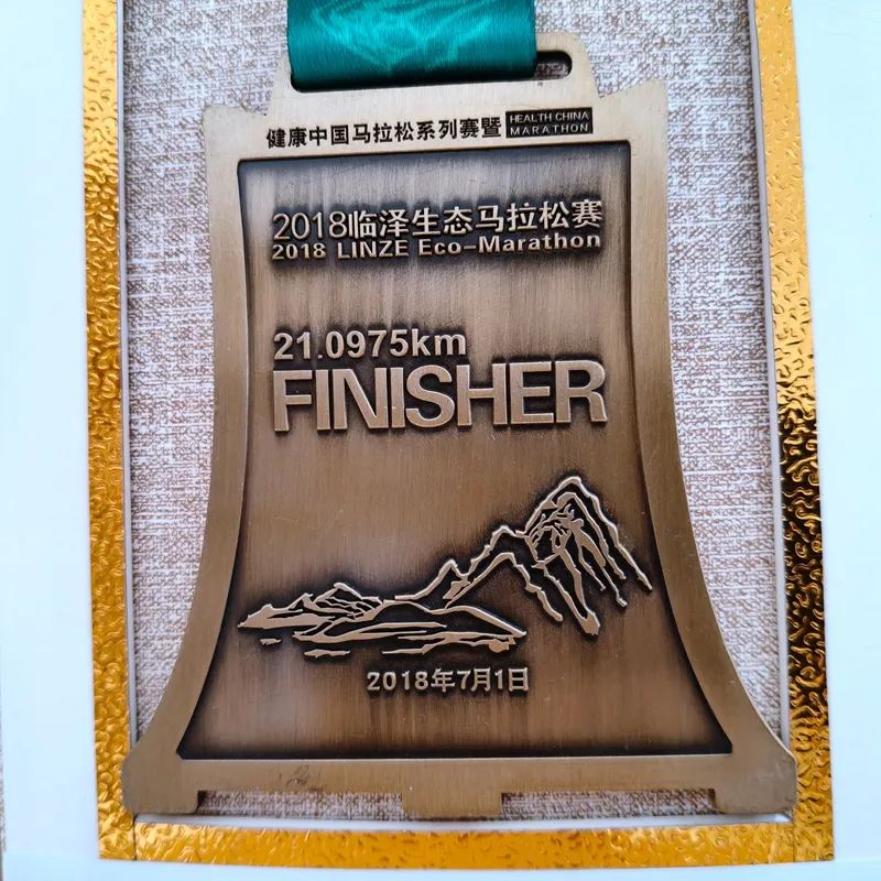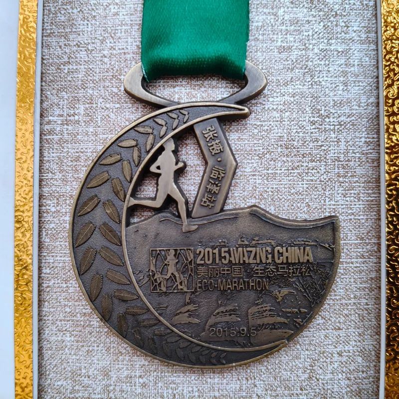2015临泽马拉松作为“美丽中国·生态马拉松”系列赛首站,完赛奖牌以古铜色半弧形为核心造型。一侧环绕叶片纹理,呼应“生态马拉松”主题;一侧嵌入跑者剪影,象征一往无前、勇敢追逐,搭配清新绿色绶带,将临泽的生态禀赋、丝路底蕴与马拉松精神凝练成了极具金属质感的荣誉符号。“张掖.临泽站”的字样,镌刻着这座城市的荣耀与骄傲,2015年的这场马拉松,成为了跑者心中永不磨灭的记忆。