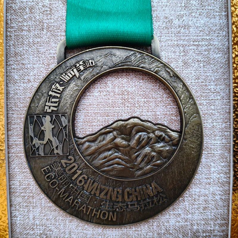 古铜圆环圈起2016的夏,此届马拉松完赛奖牌采用铜质材质,奖牌主体为圆形,中央镂空圆环象征着无限与循环,寓意着马拉松运动的不断传承和跑者对自我的持续挑战。下方雕刻着丹霞山图案,左侧有跑步者的剪影,生动展现了马拉松运动的活力与激情。绿色缎带代表着生态环保,呼应了“生态马拉松”的主题。文字的立体雕刻既增添了奖牌的质感,又突出了赛事的重要信息。
