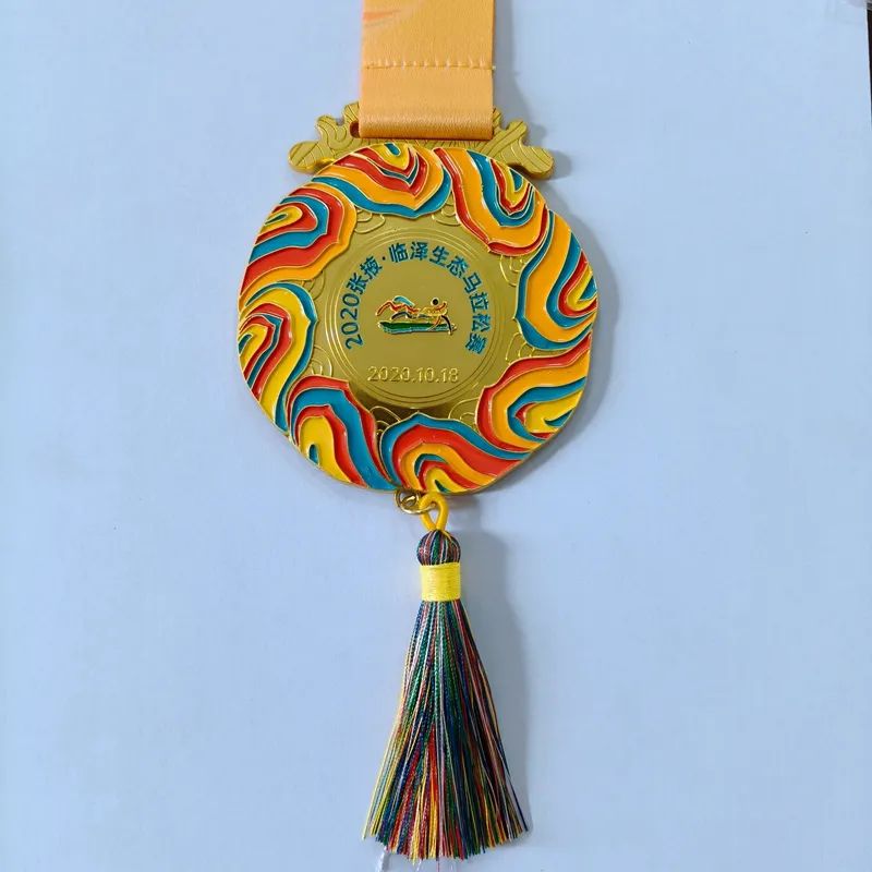 2020临泽马拉松完赛奖牌,将七彩丹霞融入其中,以环形围绕在奖牌周边,中间设有本次赛事的logo、名称以及比赛日期。奖牌下方的七彩流苏,不仅象征着七彩丹霞,更象征着此次临马,如同彩虹般绚烂多彩。