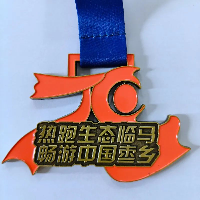 2019临泽马拉松完赛奖牌不仅是一件精美的赛事纪念品,更是以独特方式向中华人民共和国成立70周年献上的一份深情贺礼,这枚融合了临泽历史文脉与时代精神的奖牌,在细节处彰显着对祖国的祝福。奖牌的主要元素为红色“70”字样,在奖牌圆口处嵌入一颗可转动的临泽红枣,立体展现出生态临泽、秀美枣乡的魅力。黄铜色“热跑生态临马 畅游中国枣乡”字样,形象地突出了临泽的生态发展。