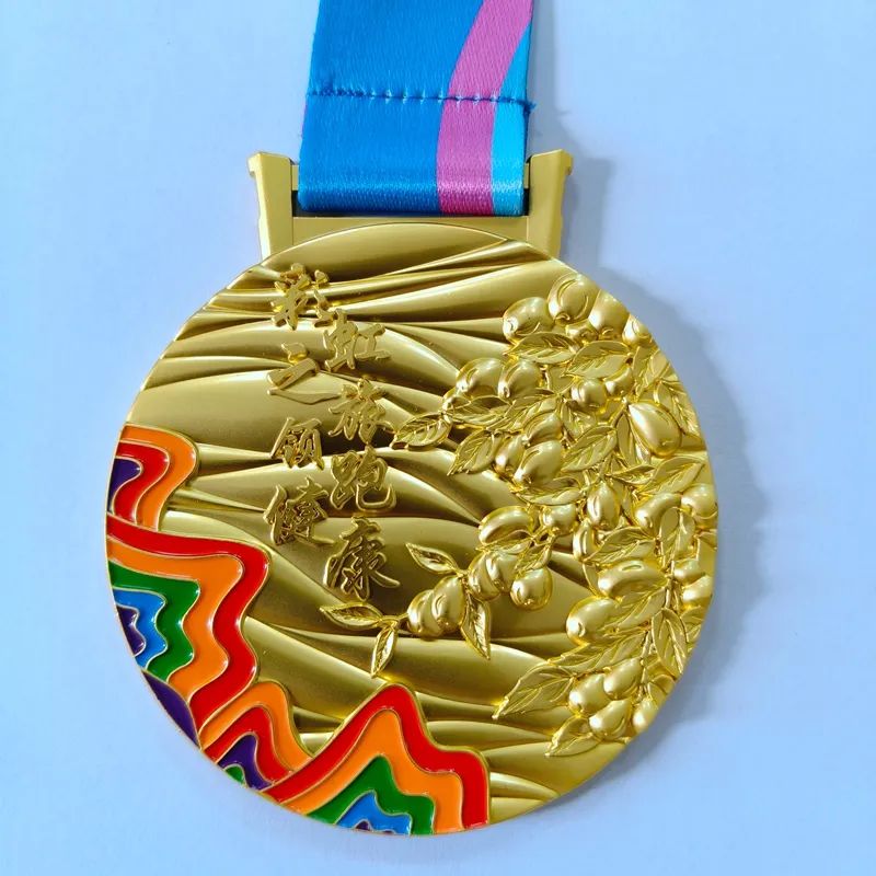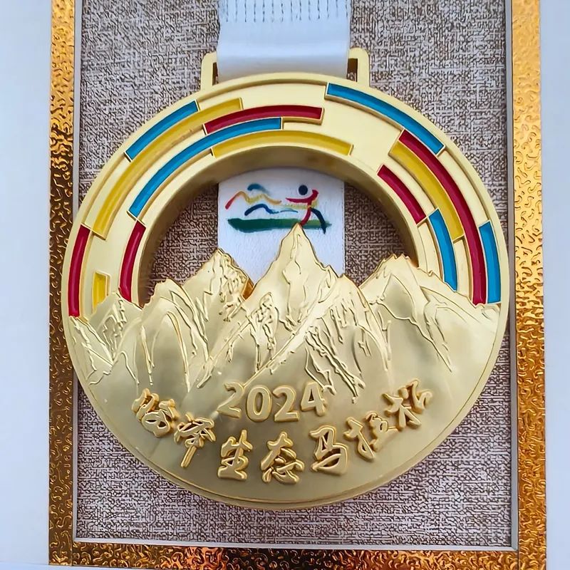 2024临泽马拉松奖牌通过现代而简洁的设计风格,展现马拉松运动的魅力与参赛者的坚韧不拔。奖牌以金色为主色调,正面中央采用山峰图案,展现出了七彩丹霞的秀美,在山峰图案的上方,巧妙地融入了彩虹色条纹元素,象征着希望、美好与胜利,它也是临泽彩虹赛道的体现,凸显了赛事的专业性和纪念价值。(李伟丽)