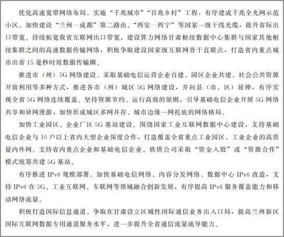 数字基础设施加速升级。网络基础设施建设步伐明显加快,互联互通能力显著改善。全省建设移动通信基站达到18.6万个,其中4G(第四代移动通信)基站数量比重接近60%。截至2020年底,全省14个市(州)实现主城区5G(第五代移动通信)网络覆盖,5G网络人口覆盖率达到24%以上,县(市、区)网络平均出口带宽达到200G以上,百兆以上宽带用户占比达到92.5%;行政村光纤宽带和4G网络覆盖率达到99%以上。兰州建成西北第二大信息通信网络枢纽,互联网出省带宽达到14.8T,实现与北京、西安、成都等核心节点城市以及西宁、拉萨、乌鲁木齐、银川等重点城市的网络直联。以兰州新区国际互联网数据专用通道为依托,建成兰州新区至金昌、酒泉、天水等市高速网络链路,有效提升通道运营服务能力。统筹布局大数据中心,数字化基础设施建设实现跨越式发展。截至2020年底,全省建成运行300个机柜以上数据中心36个,各类数据中心机架总数达到59012架,可对外提供服务机柜30176个,PUE(平均电能利用效率)值1.31。金昌紫金云大数据中心、丝绸之路西北大数据产业园数据中心、甘肃联通马滩大数据中心、甘肃国网云数据中心等投入运营。在建或拟建数据中心项目17个,可部署机架(功率超过2.5KW)12.1万架,设计PUE值约1.27,绿色集约大数据集群初步形成。