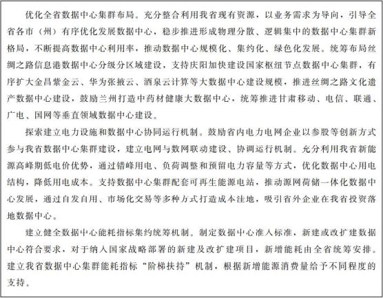 围绕全国一体化算力网络国家枢纽节点(甘肃)建设,统筹优化全省数据中心布局,引导传统数据中心升级改造,向规模化、集约化、智能化、绿色化方向布局发展。探索建立电力设施和数据中心协同运行机制、数据中心能耗指标共享统筹机制。