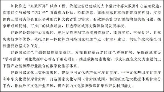 按照国家要求,建设甘肃省一体化大数据中心协同创新体系,引导数据中心集约化、规模化、绿色化发展。充分发挥我省资源优势,重点提升算力服务品质和利用效率,积极承接后台加工、离线分析、存储备份等非实时算力需求,打造面向全国的非实时性算力保障基地。