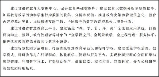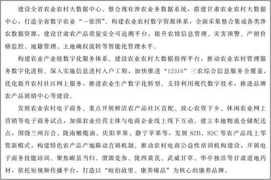 到2021年底,初步构建数字甘肃基本框架,推动数字经济发展的政策和配套体系基本成型,交通文旅、就业社保、生态环境等领域试点示范初见成效,全国一体化算力网络国家枢纽节点(甘肃)启动建设,确立甘肃在数据要素汇聚、大数据产业集聚、数据创新应用等领域优势。