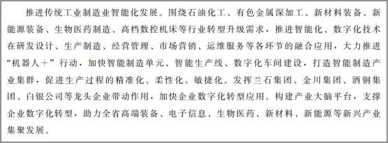 围绕沿黄河流域、河西走廊、陇东南三大产业聚集带的空间布局,聚焦石化、能源、冶金、装备制造等重点行业,打造智能制造产业集群,全面提升企业数字化水平,形成智能制造为驱动的新型工业体系。