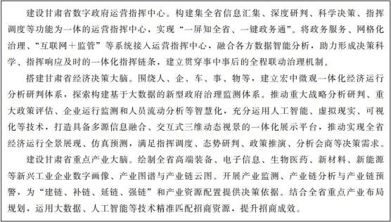 以数字政府建设为驱动,以城市规划、建设、管理、服务数据为基本要素,运用城市信息模型、虚拟仿真等技术,搭建甘肃省数字政府运营指挥中心,建设宏中微观一体化经济决策大脑、产业大脑,培育数据驱动、协同融合、共创共享的大数据应用生态体系,支持全省重大决策。