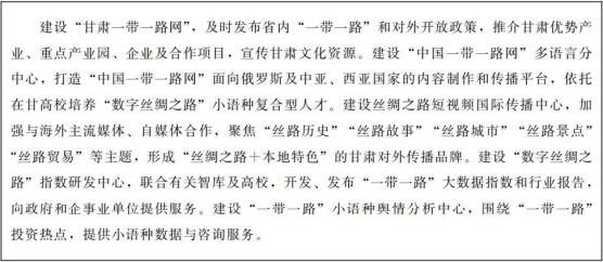 推进海外数据在甘肃汇集、分析、落地应用,加强同“一带一路”沿线国家在数字化、网络化、智能化方面的国际合作,促进文化国际传播交流,打造“数字丝绸之路”的重要门户和核心节点。