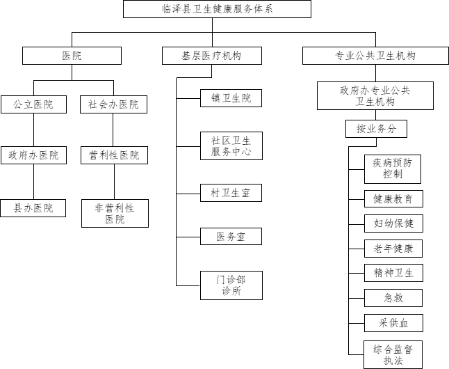 专业公共卫生机构主要包括疾病预防控制、健康教育、妇幼保健、老年健康、精神卫生、急救、采供血、综合监督执法等机构,均由政府主办。(全县卫生健康服务体系架构如下图)