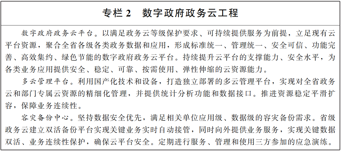 2.提供开放共享的政务云服务。坚持省级统筹,整合现有云资源,完善省市两级政务云平台,推动系统迁移上云。建设多云管理平台,对数字政府政务云平台进行统一管理、监控和运维。同步建设容灾备份设施,完善应急保障机制,确保政务云稳定安全可靠。