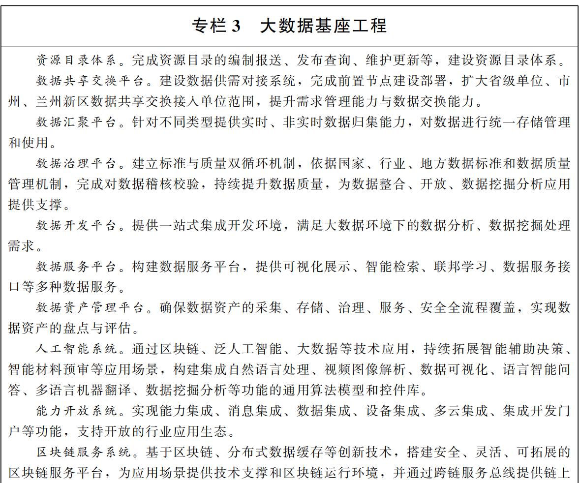 ——打造赋能特色数字政府。聚焦甘肃数字政府特色品牌建设,深化区块链应用,加快推进公共数据开放共享和数据标准化建设,深度应用于政务服务、城市管理、民生服务等方面,数据价值不断凸显,数字政府引领智慧城市、数字经济、数字社会发展。