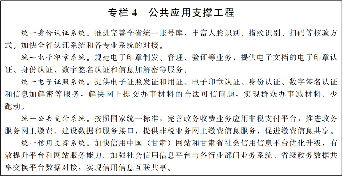 4,建设公共应用支撑体系。按照全省数字政府统一技术架构体系,建设应用系统基础支撑体系,为各级各部门和各类应用系统提供公共应用支撑保障。