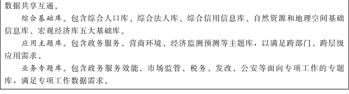 一个大数据基座:构建全省一体化大数据基座,建设开放共享的数据汇聚体系、标准规范的数据治理体系、安全可信的数据服务体系,推动全省政务、行业、社会数据的汇聚、治理、服务和开放,发挥数据资源价值,赋能数字政府建设。