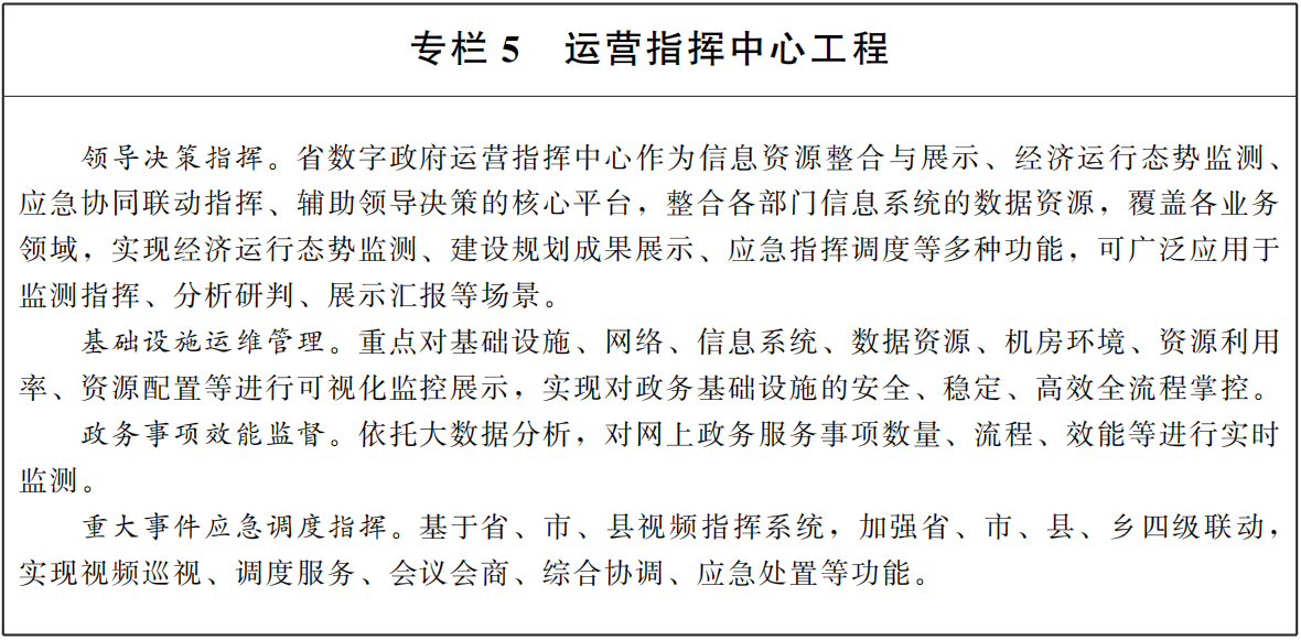 一个运营指挥中心:构建集信息汇集、深度研判、科学决策、指挥调度、服务监督、效能评估等功能为一体的运营指挥中心,实现一屏知全省、一键政务通。将政务服务、网格化治理、“互联网+监管”等系统接入运营指挥中心,融合各方数据智能分析,形成决策科学、指挥响应及时的一体化指挥链条,建立贯穿事前事中事后的全程联动治理机制。