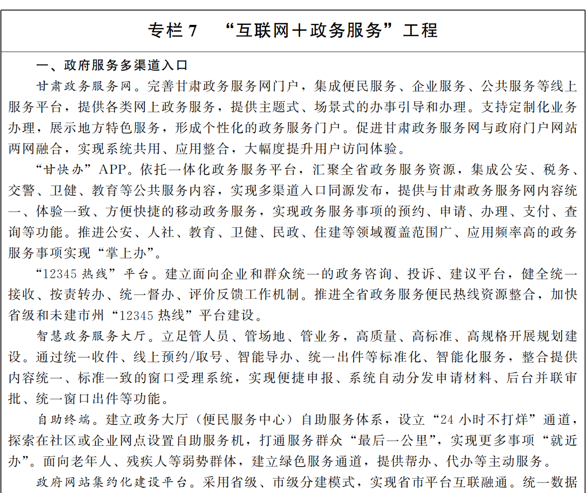推动政务服务规范化。统筹归并网上办事入口,推动多渠道无差别服务,持续优化甘肃政务服务网、“甘快办”APP、“12345热线”,实现网上办事“一次注册、多点互认、全网通行”。规范网上办事指引,提供更加简便易懂的办事指南和线上办事操作说明,创新在线导办、智能推荐等手段,实现“一端在手、一看就懂、一点就能办”。深化各级政府网站、政务服务平台适老化、无障碍改造。建设全科无差别受理智慧政务服务大厅,统筹推进线上线下服务融合互通,提升政务服务便捷性。