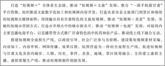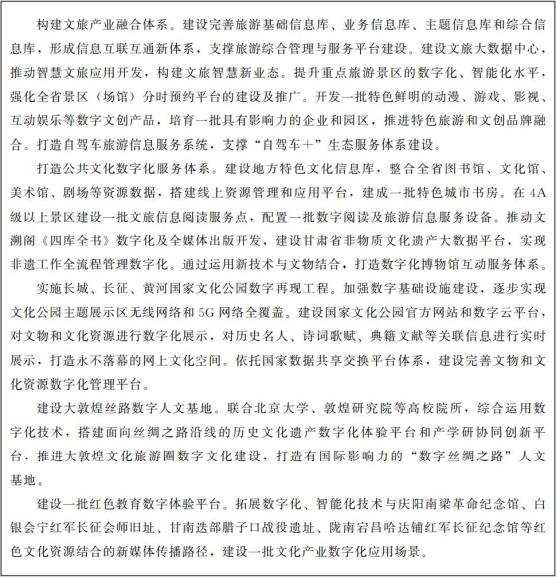 充分挖掘甘肃厚重的历史文化旅游资源,在文化、旅游、民俗、美食、电商等领域与5G、短视频、音频、虚拟现实、在线直播等新技术业态相结合,引入短视频服务类、音频服务类、云服务类、电商类企业,以数字内容生产为抓手,打造“线上引流、线下转型”的发展新模式,实现“一业带百业”。
