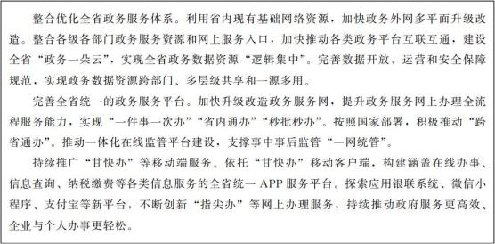 数字政务体系日趋完备。数字政务平台建设取得长足发展,政务云及互联网、政务专网等基础设施建设初具规模。政务服务便利化程度显著提升,建成“甘快办”移动端服务平台,积极打造“掌上办”“指尖办”甘肃品牌。甘肃省涉企政策精准推送和“不来即享”服务系统覆盖全省41.8万户企业,获得国务院表彰。政务数据共享开放水平不断提升,“数据共享负面清单”全面推行,省级数据共享交换平台及政务信息共享网站建成投运,实现国家、省、市数据共享交换平台级联对接。