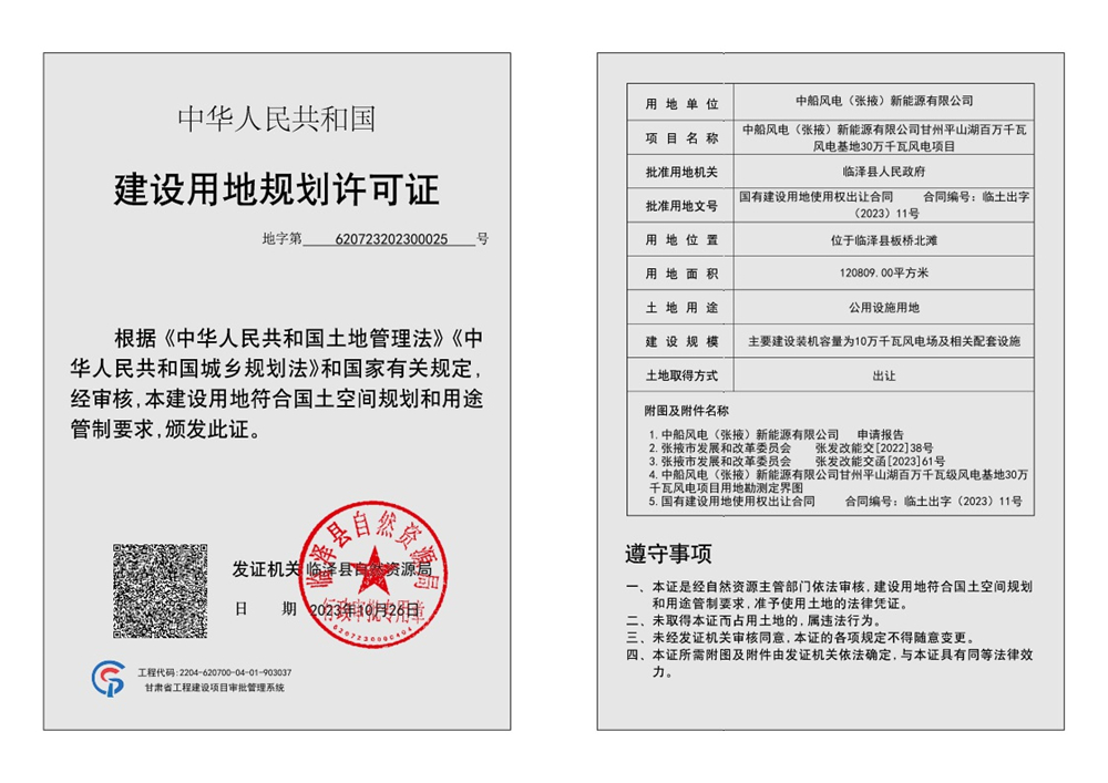 中船风电(张掖)新能源有限公司甘州平山湖百万千瓦风电基地30万千瓦风电项目《建设用地规划许可证》公示