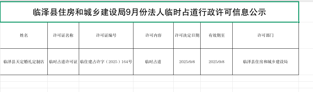 临泽县住房和城乡建设局9月份法人临时占道行政许可信息公示
