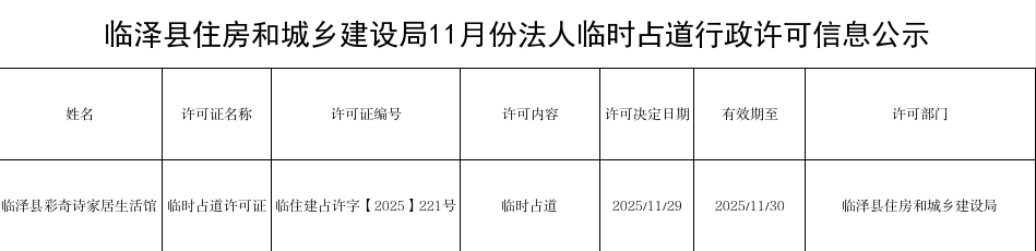 临泽县住房和城乡建设局11月份法人临时占道行政许可信息公示