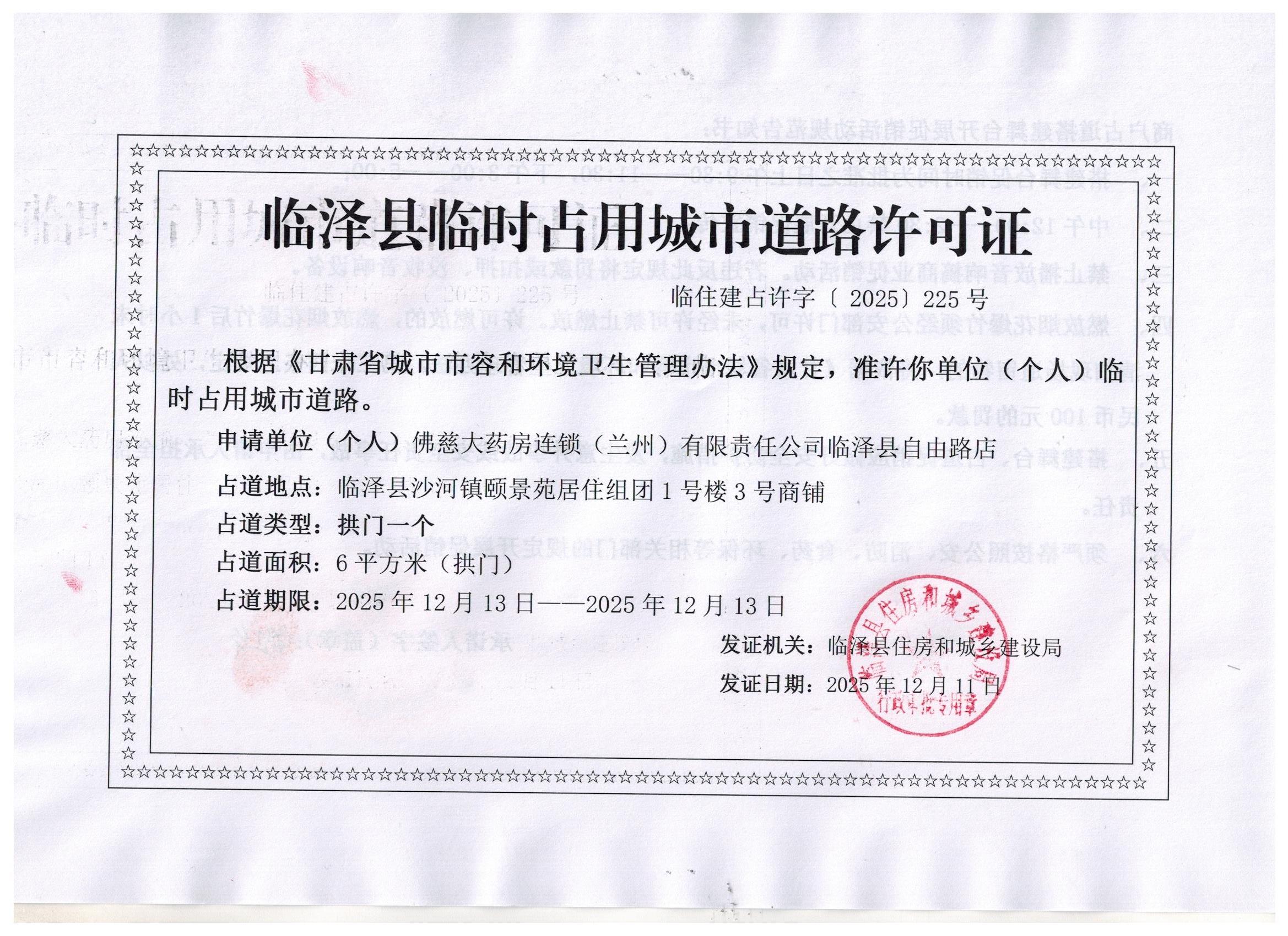 临泽县住房和城乡建设局对佛慈大药房连锁(兰州)有限责任公司临泽县自由路店占道的许可证