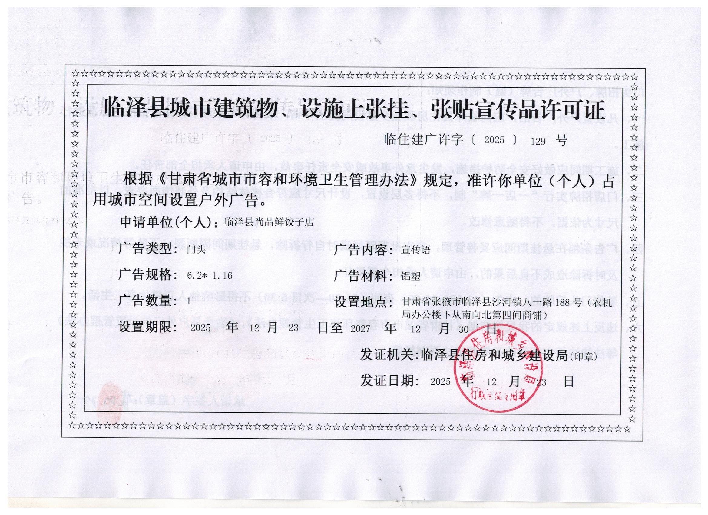 临泽县住房和城乡建设局对临泽县尚品鲜饺子店户外广告的许可证