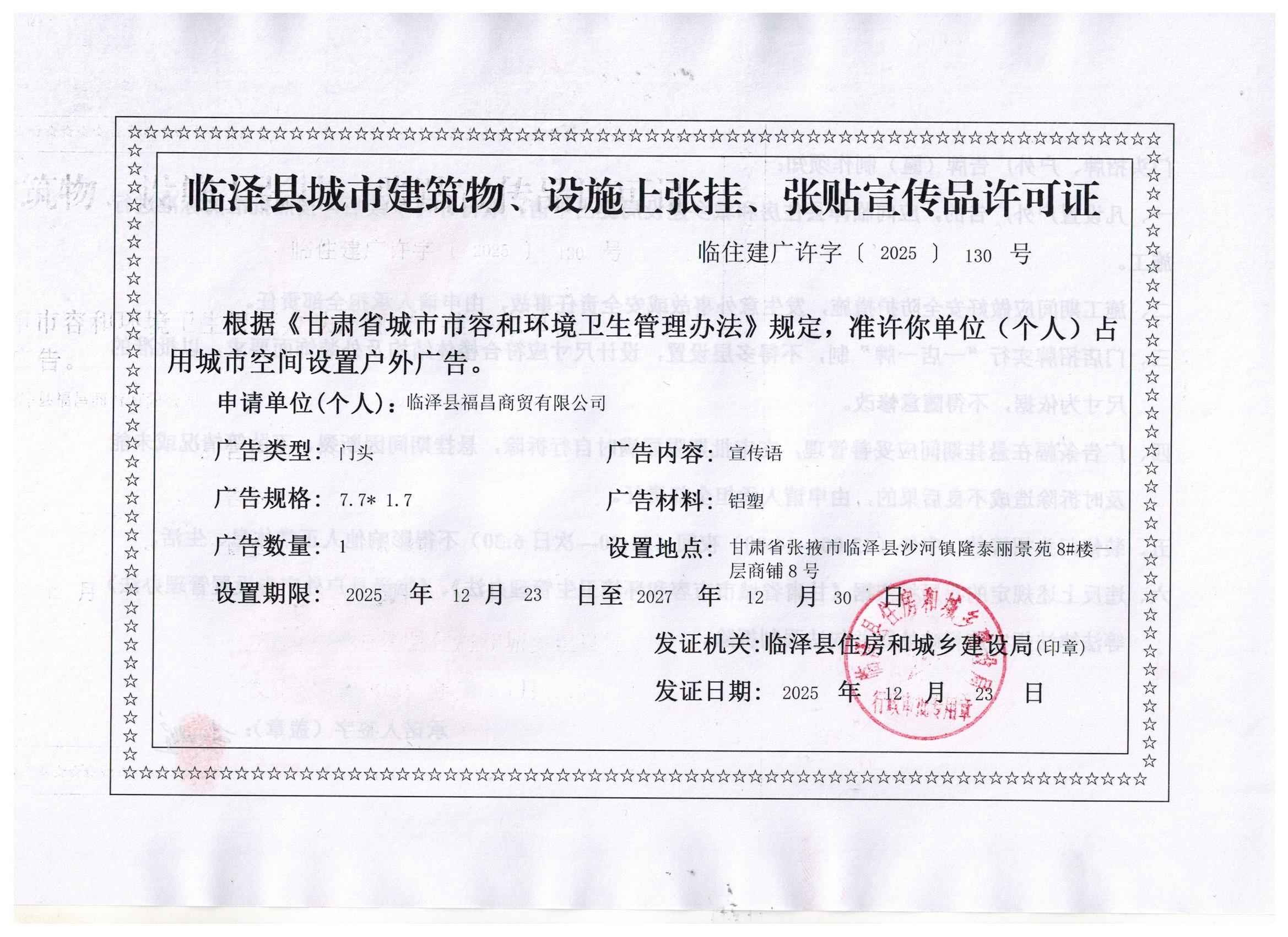 临泽县住房和城乡建设局对临泽县福昌商贸有限公司户外广告的许可证