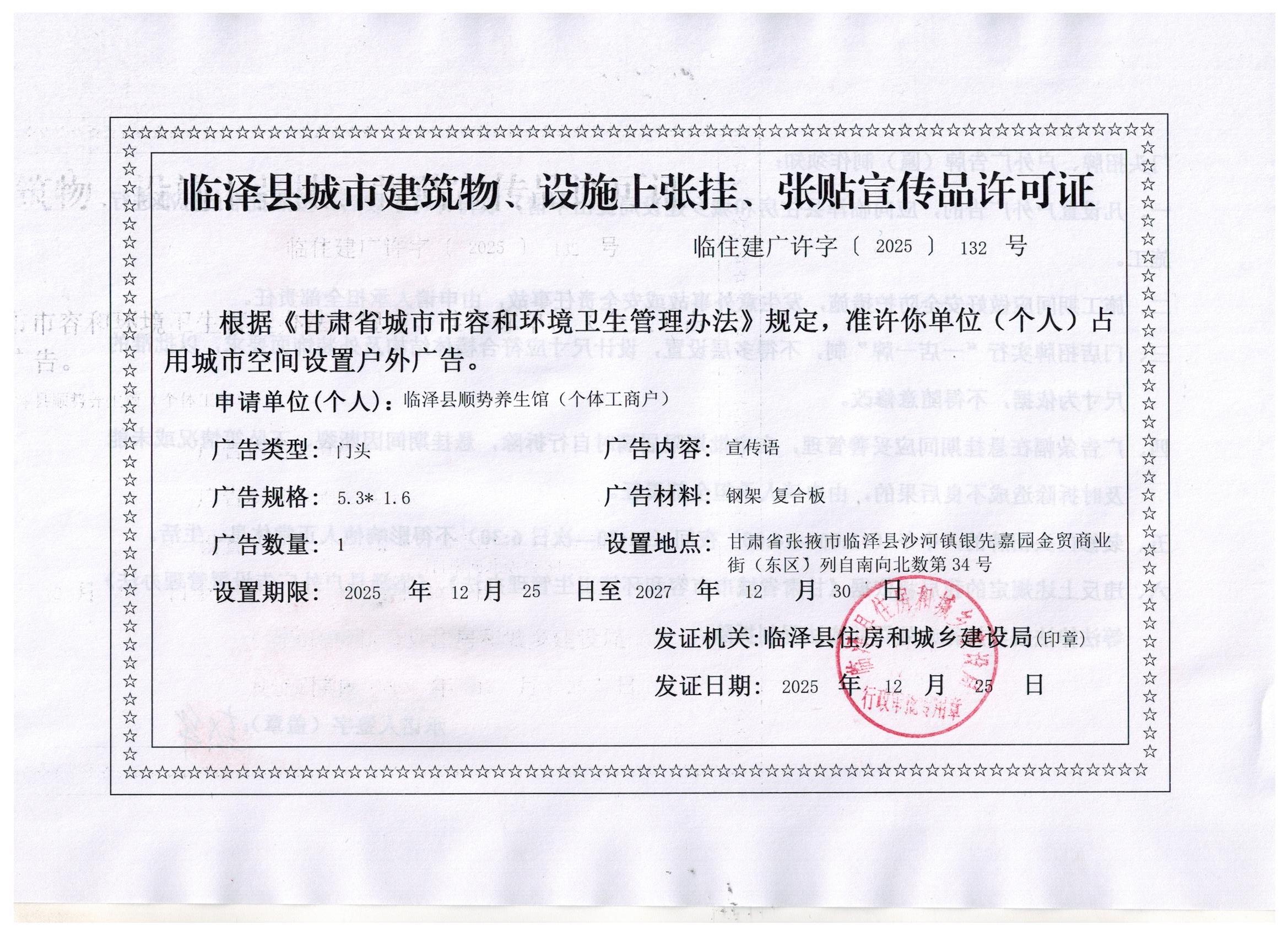 临泽县住房和城乡建设局对临泽县顺势养生馆户外广告的许可证