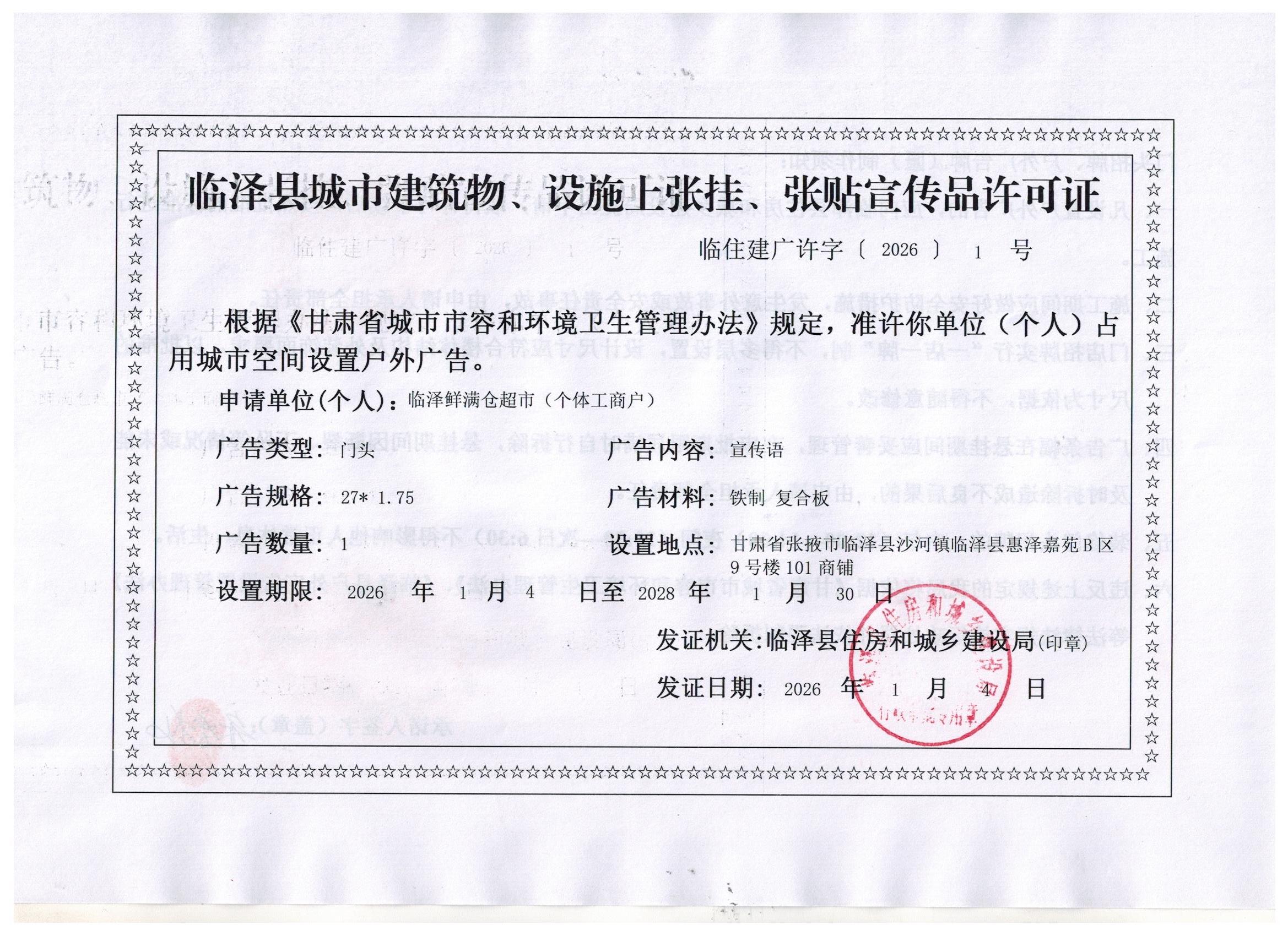 临泽县住房和城乡建设局对临泽鲜满仓超市户外广告的许可证