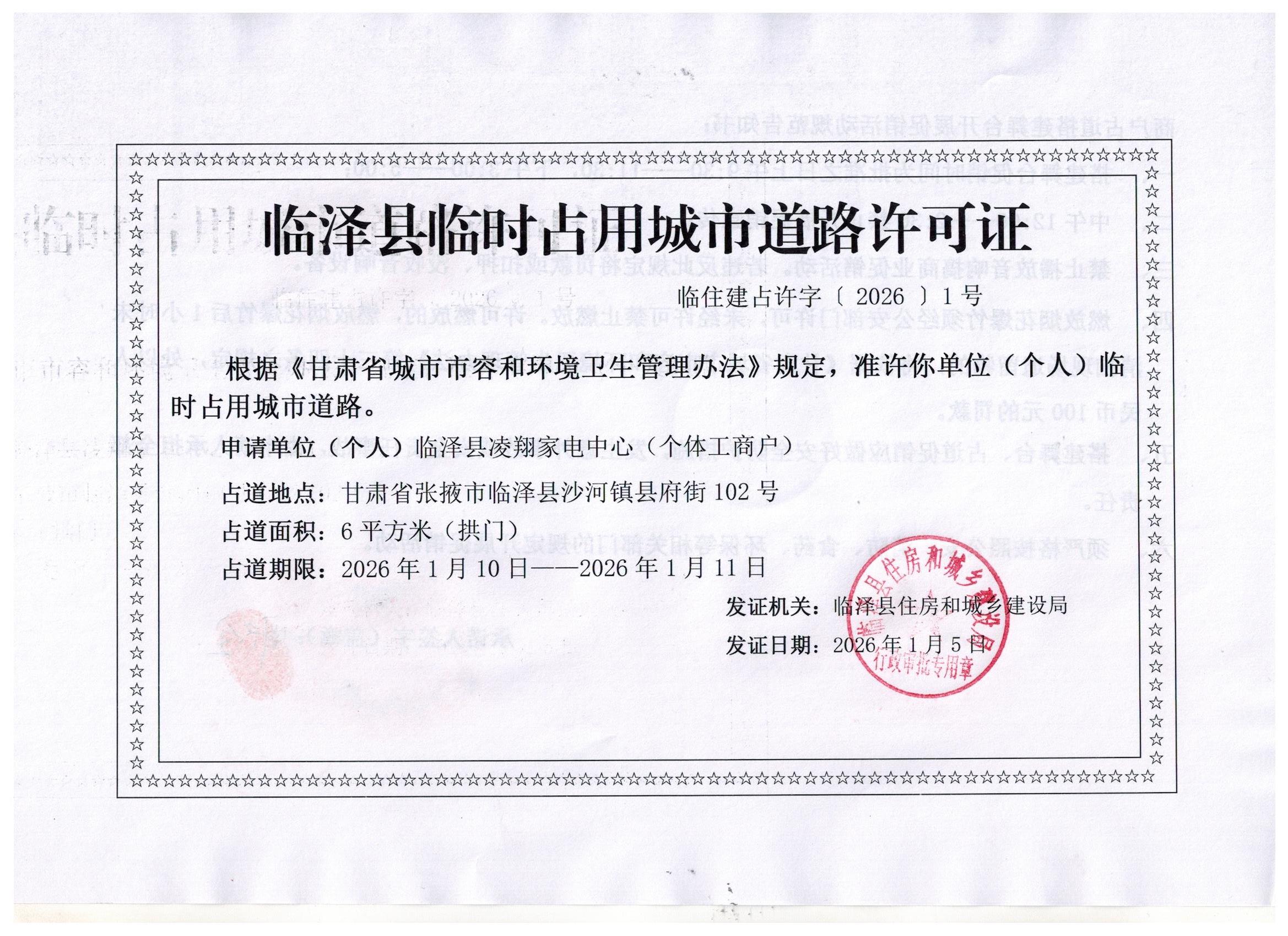 临泽县住房和城乡建设局对临泽县凌翔家电中心占道的许可证