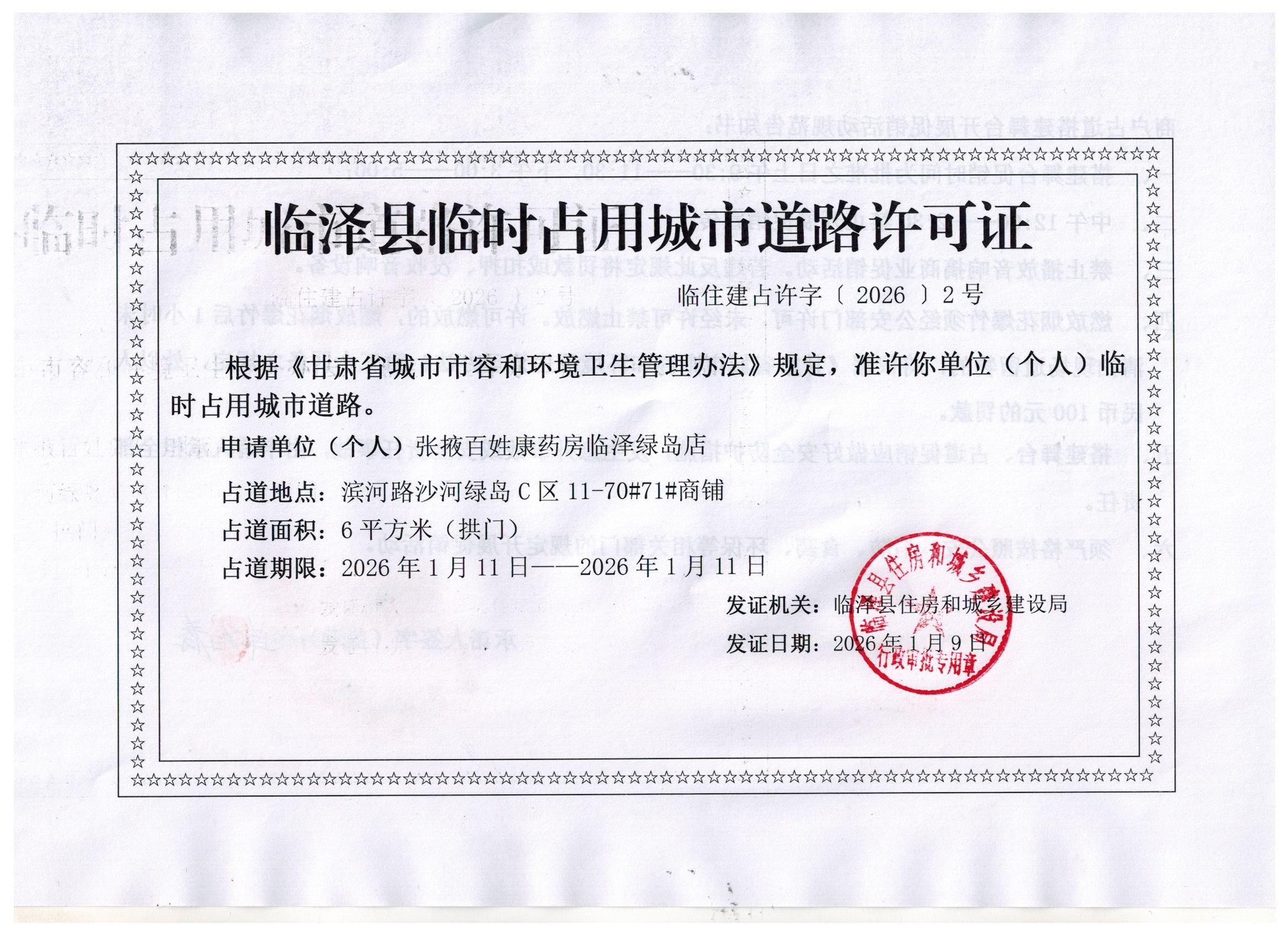 临泽县住房和城乡建设局对张掖百姓康药房临泽绿岛店占道的许可证