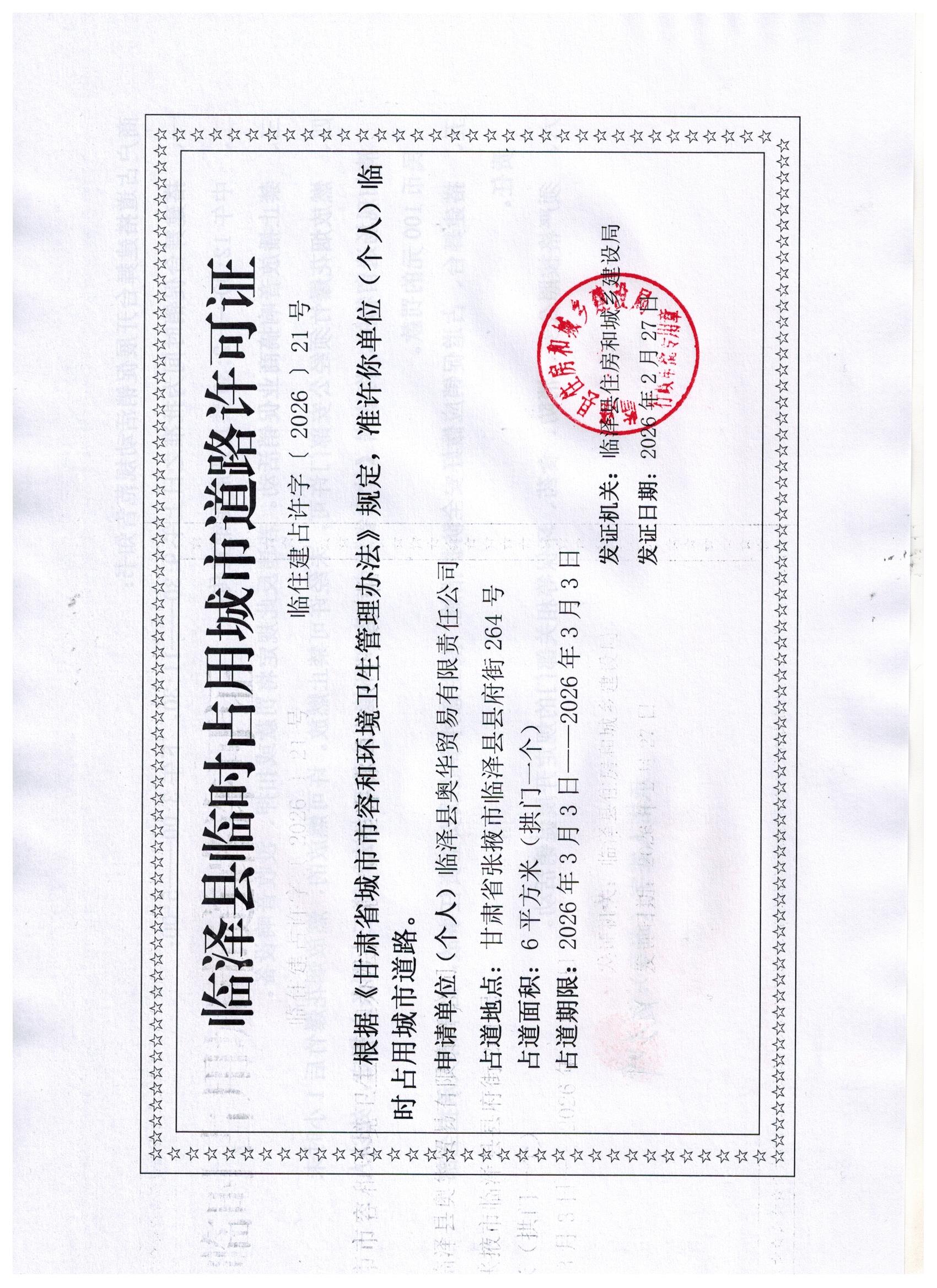 临泽县住房和城乡建设局对临泽县奥华贸易有限责任公司占道的许可证