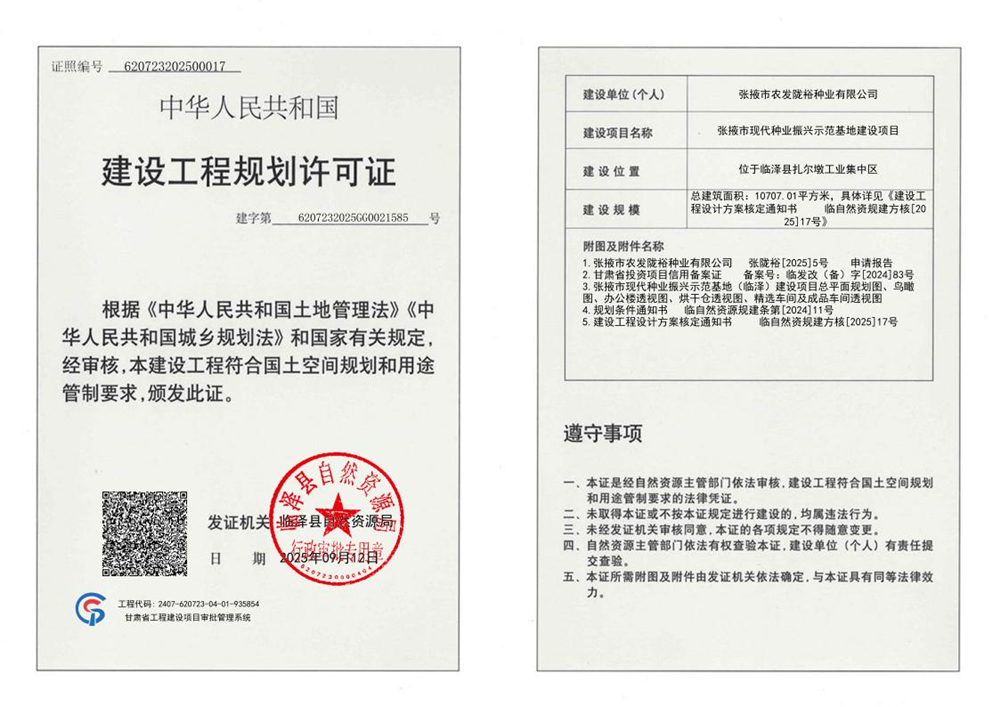 张掖市现代种业振兴示范基地建设项目《建设工程规划许可证》公示