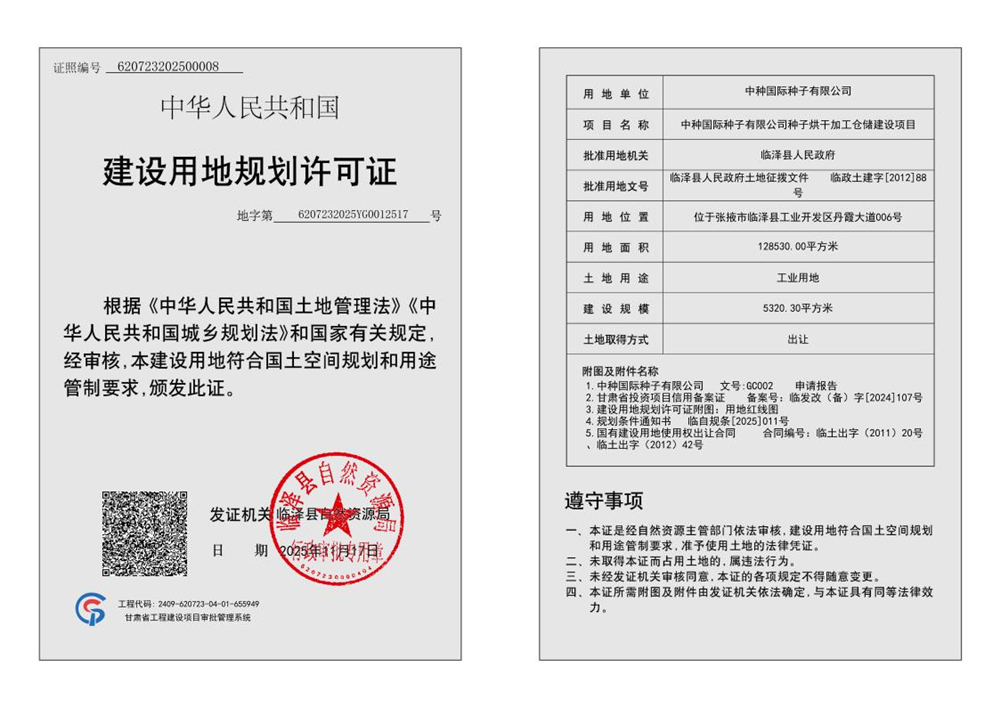 中种国际种子有限公司种子烘干加工仓储建设项目《建设用地规划许可证》公示
