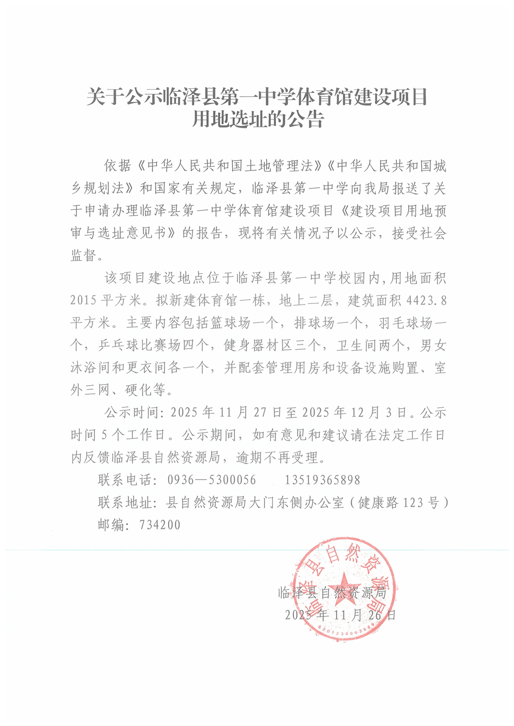 关于公示临泽县第一中学体育馆建设项目用地选址的公告