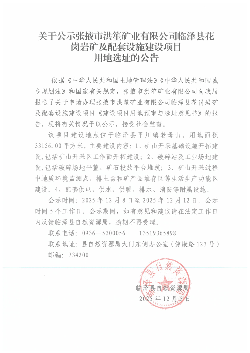 关于公示张掖市洪笙矿业有限公司临泽县花岗岩矿及配套设施建设项目用地选址的公告