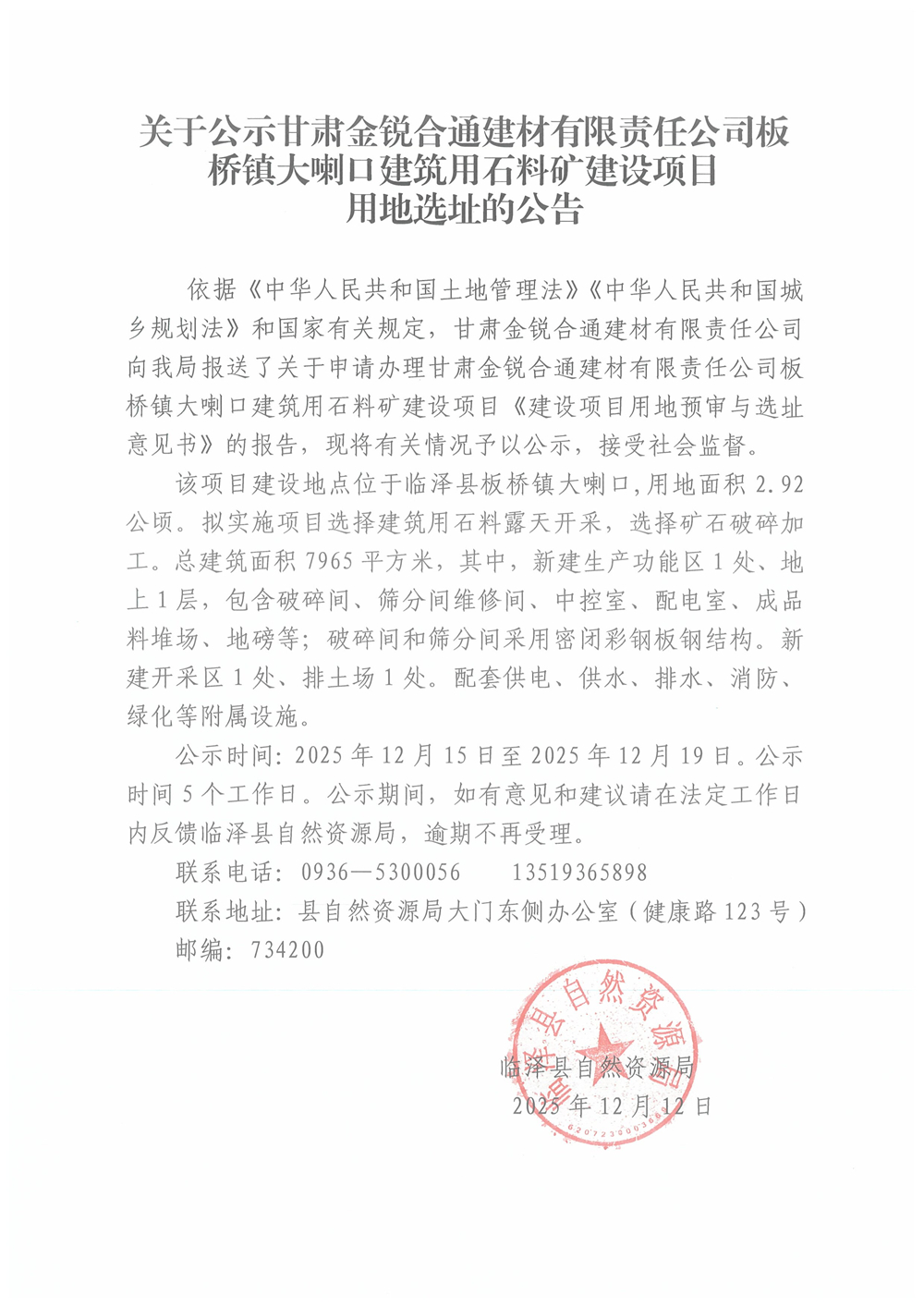 关于公示甘肃金锐合通建材有限责任公司板桥镇大喇口建筑用石料矿建设项目用地选址的公告