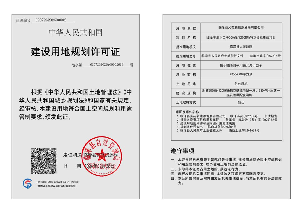 临泽平川小口子300MW/1200MWh独立储能电站项目《建设用地规划许可证》公示