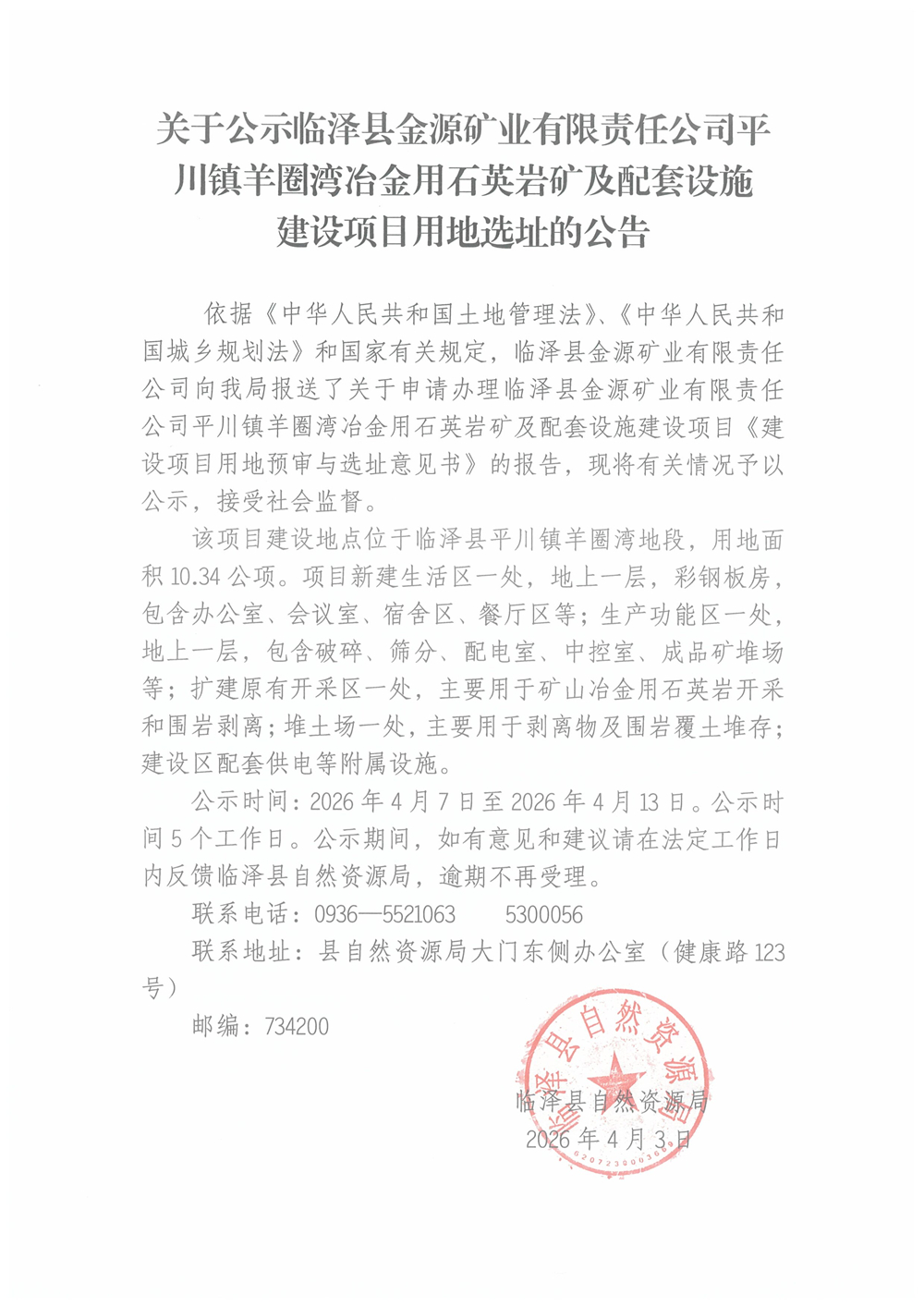 关于公示临泽县金源矿业有限责任公司平川镇羊圈湾冶金用石英岩矿及配套设施 建设项目用地选址的公告