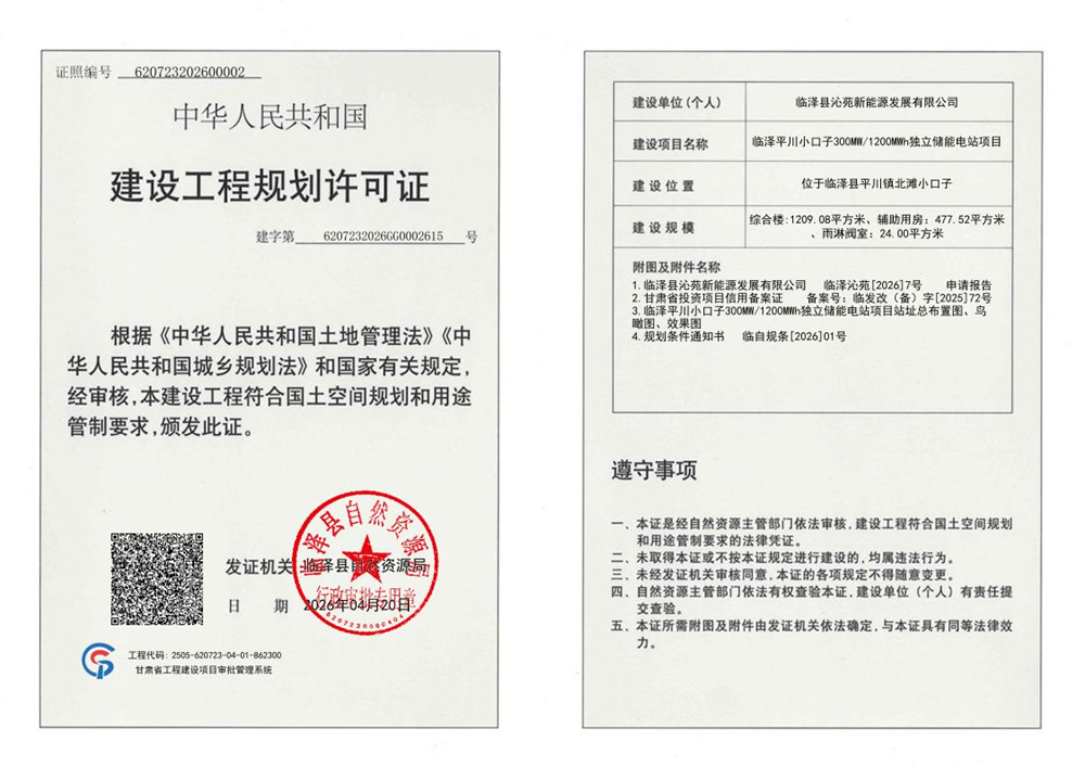 临泽平川小口子300MW/1200MWh独立储能电站项目《建设工程规划许可证》公示