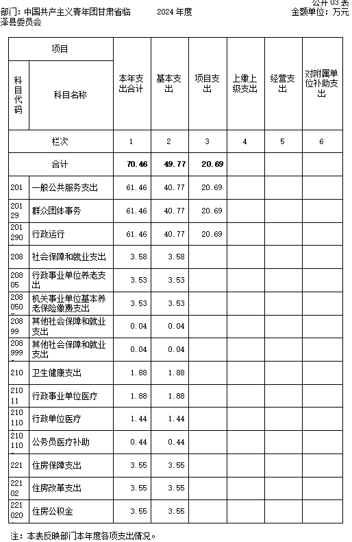 2024年度支出合计70.46万元,其中:基本支出49.77万元,占70.64%;项目支出20.69万元,占29.36%;上缴上级支出0.00万元,占0.00%;经营支出0.00万元,占0.00%;对附属单位补助支出0.00万元,占0.00%。