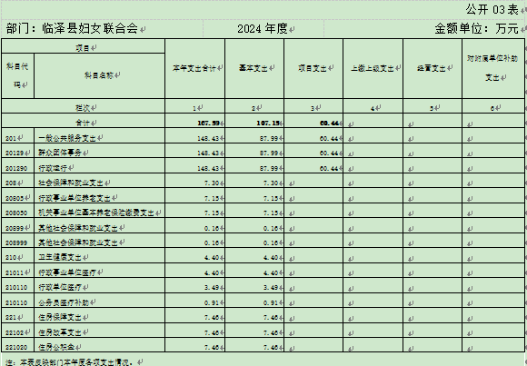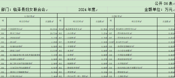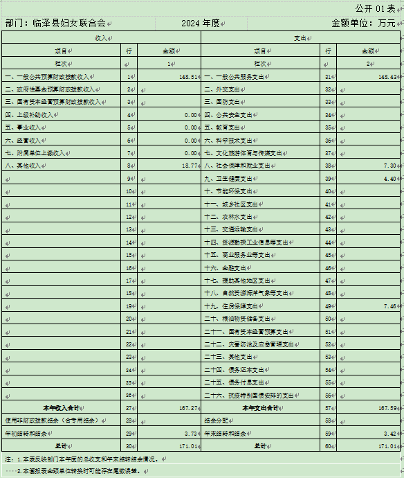 2024年度收、支总计均为171.01万元。与上年度相比,收、支总计各增加25.00万元,增长17.12%,主要原因是2024年县委县政府为民办实事为临泽户籍35-64周岁妇女购买“两癌”保险的收入380000元,支出292840。2024年人员工资社保费用福利等支出666560.62元。