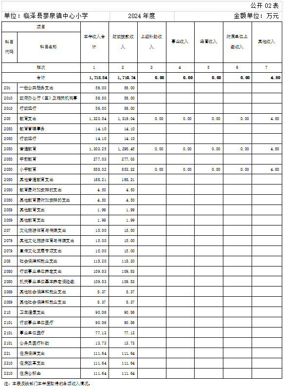 2024年度收入合计1715.54万元,其中:财政拨款收入1710.74万元,占99.72%;上级补助收入0.00万元,占0.00%;事业收入0.00万元,占0.00%;经营收入0.00万元,占0.00%;附属单位上缴收入0.00万元,占0.00%;其他收入4.80万元,占0.28%;