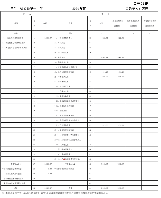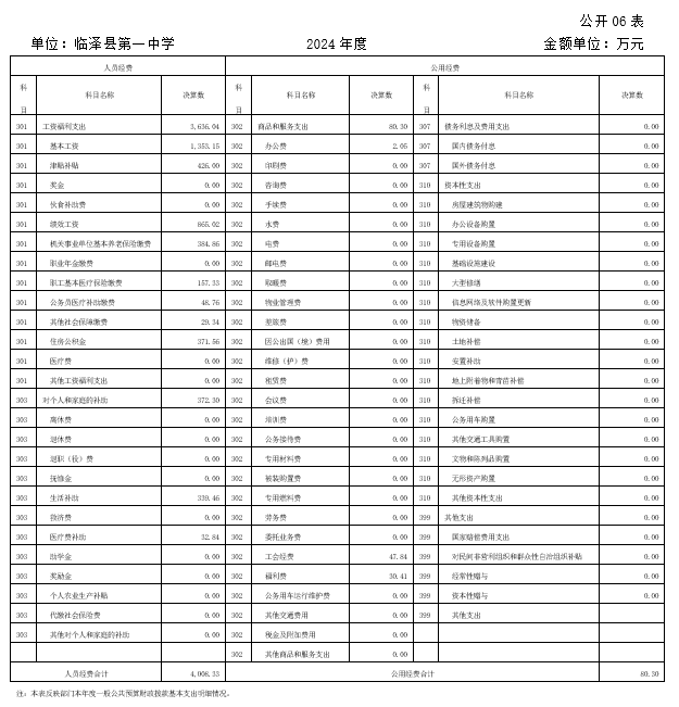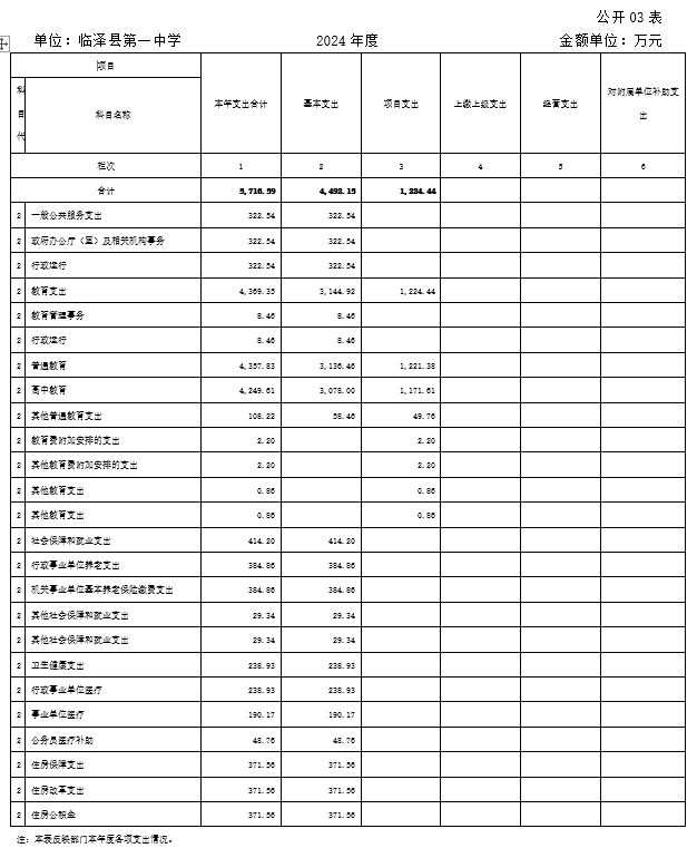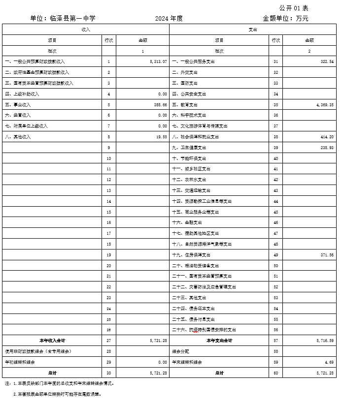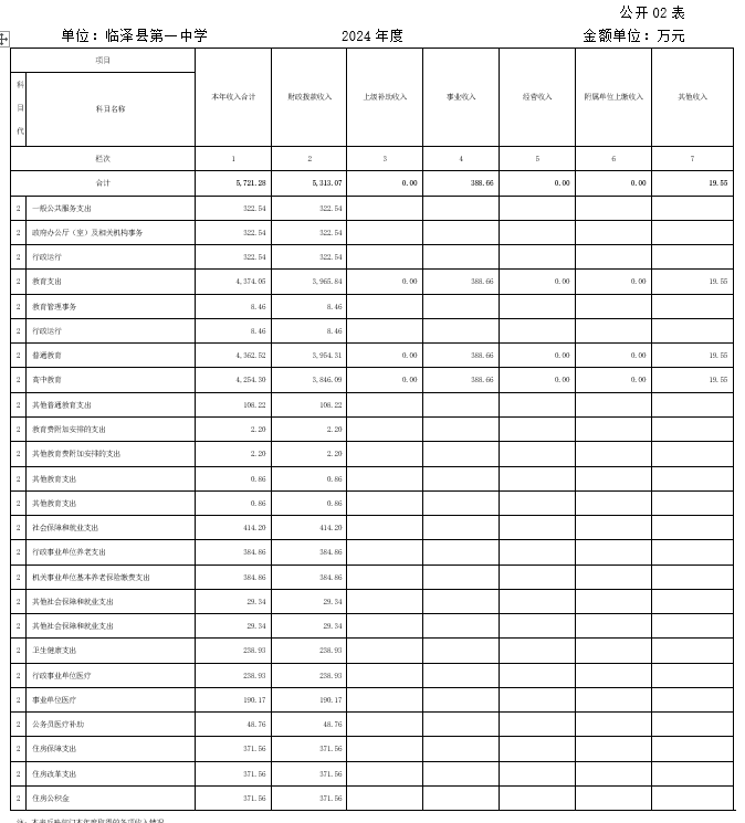 2024年度收、支总计均为5721.28万元。与上年度相比,收、支总计各增加496.93万元,增长9.51%,主要原因一是2024年秋学期普通高中扩招,生源规模扩大,事业收入相应提高;二是年内通过人才引进补充教师及从外校调入了部分教师,相应支出增加;三是人员工资调整、社保、住房公积金缴费增加,使人员经费增长。