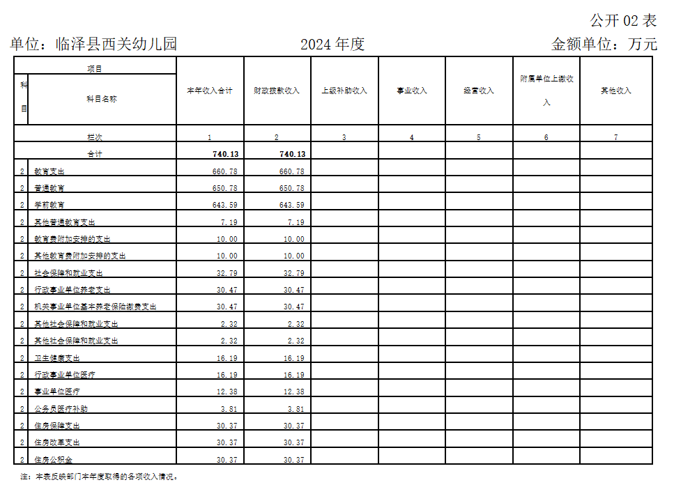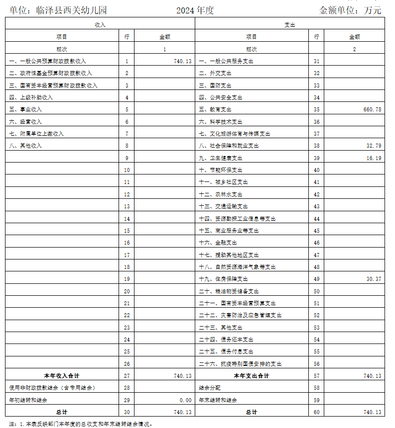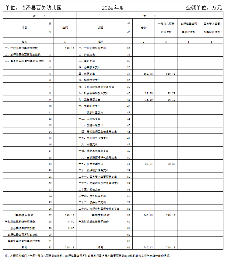 2024年度收、支总计均为740.13万元。与上年度相比,收、支总计各减少931.71万元,下降55.73%,主要原因是幼儿园建设项目已完工并投入使用,项目资金减少。