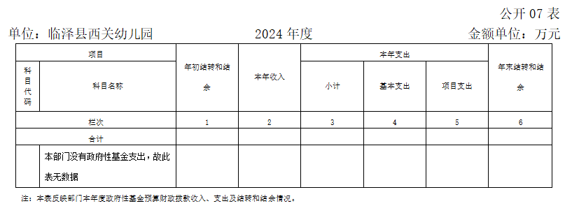 2024年度政府性基金预算财政拨款年初结转和结余0.00万元,本年收入0.00万元,本年支出0.00万元,年末结转和结余0.00万元。