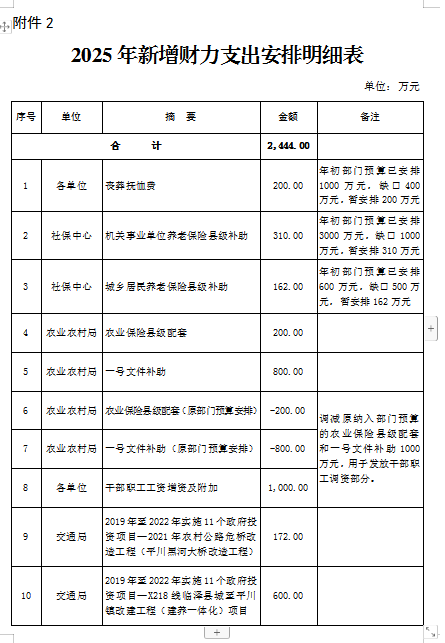 2.新增结算补助收入支出2282万元,用于安排落实农业保险县级配套、一号文件补助、化解2018年纳入债务监测平台部分符合条件的债务(具体项目详见附表2)