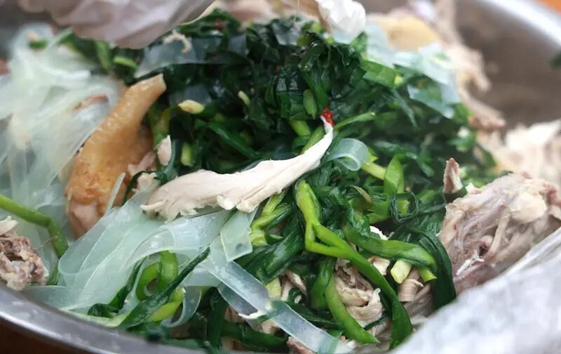 香气是这场春日集市最直接的注脚。循着浓郁肉香步入丹霞口美食街,一字排开的大锅热气腾腾、白汤翻滚,大厨们在锅灶前忙得不亦乐乎。草芽鸡因春季散养土鸡采食初生草芽而得名,是临泽流传已久的时令佳肴。与其他地方重油重辣的做法不同,临泽草芽鸡的妙处恰在一个“本”字——精选本地散养土鸡,清水慢炖,不添加过多繁杂调料,只为保留鸡肉最本真的味道。出锅后的草芽鸡,皮黄肉白,色泽诱人;大厨们麻利地顺着关节和纹理将鸡肉手撕分解,形散神不散,让鸡肉充分吸收浓郁的汤汁。而这道菜的点睛之笔,便是那一抹嫩绿的头茬韭菜和雪白的粉皮——头茬韭菜辛辣提味,粉皮晶莹剔透,青绿配雪白,一锅春意便扑面而来。现场游客不仅能全程观摩草芽鸡的制作技艺,还可以免费品尝这道春日限定的临泽招牌美味。来自兰州的游客居沛蓉边尝边赞:“第一次来丹霞,不仅被这里的美景震撼,更被这口鲜香的草芽鸡圈粉,旅游环境也很棒。”